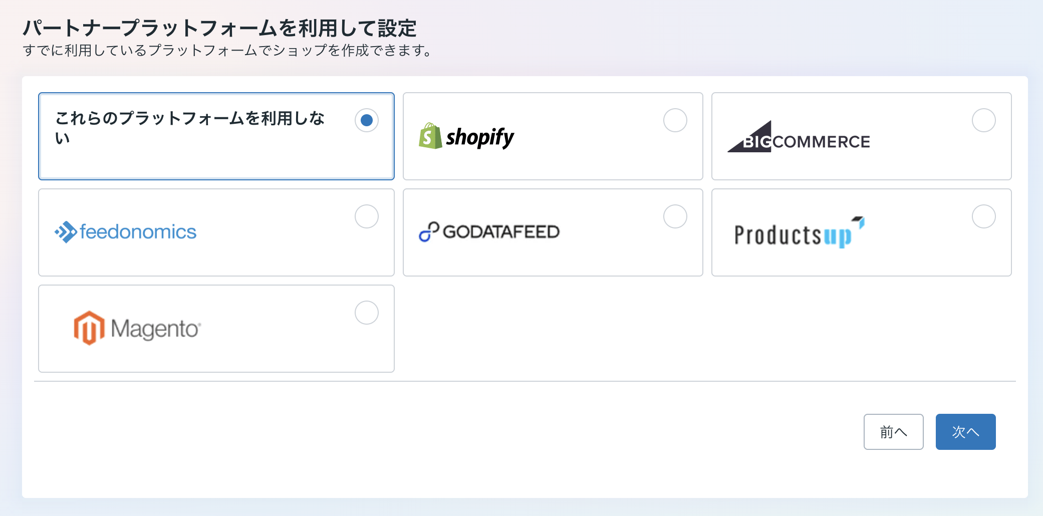 Shopify等以下に示すようなプラットフォームを利用して販売を行なっている方はここでそのプラットフォームを登録してください。