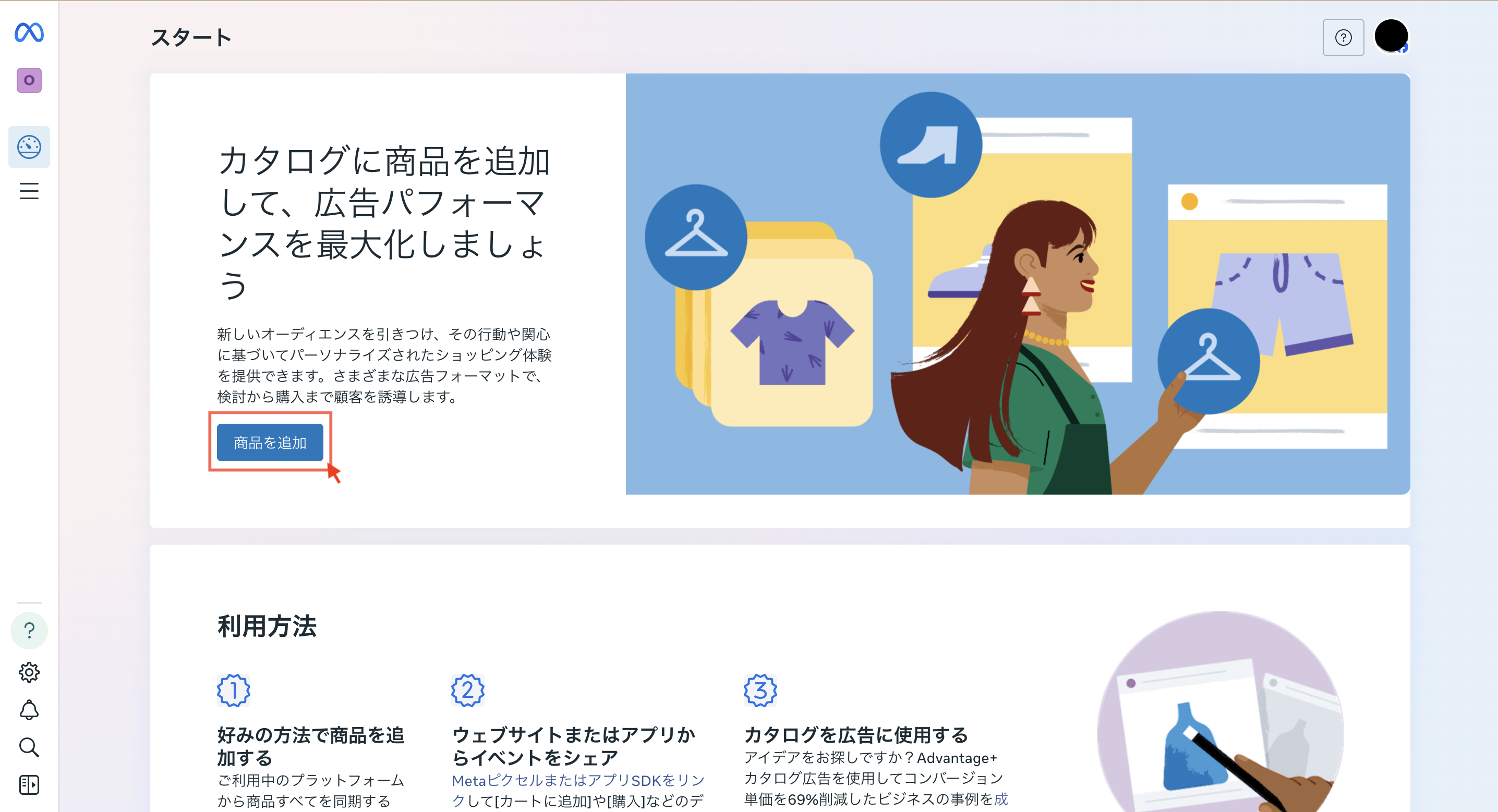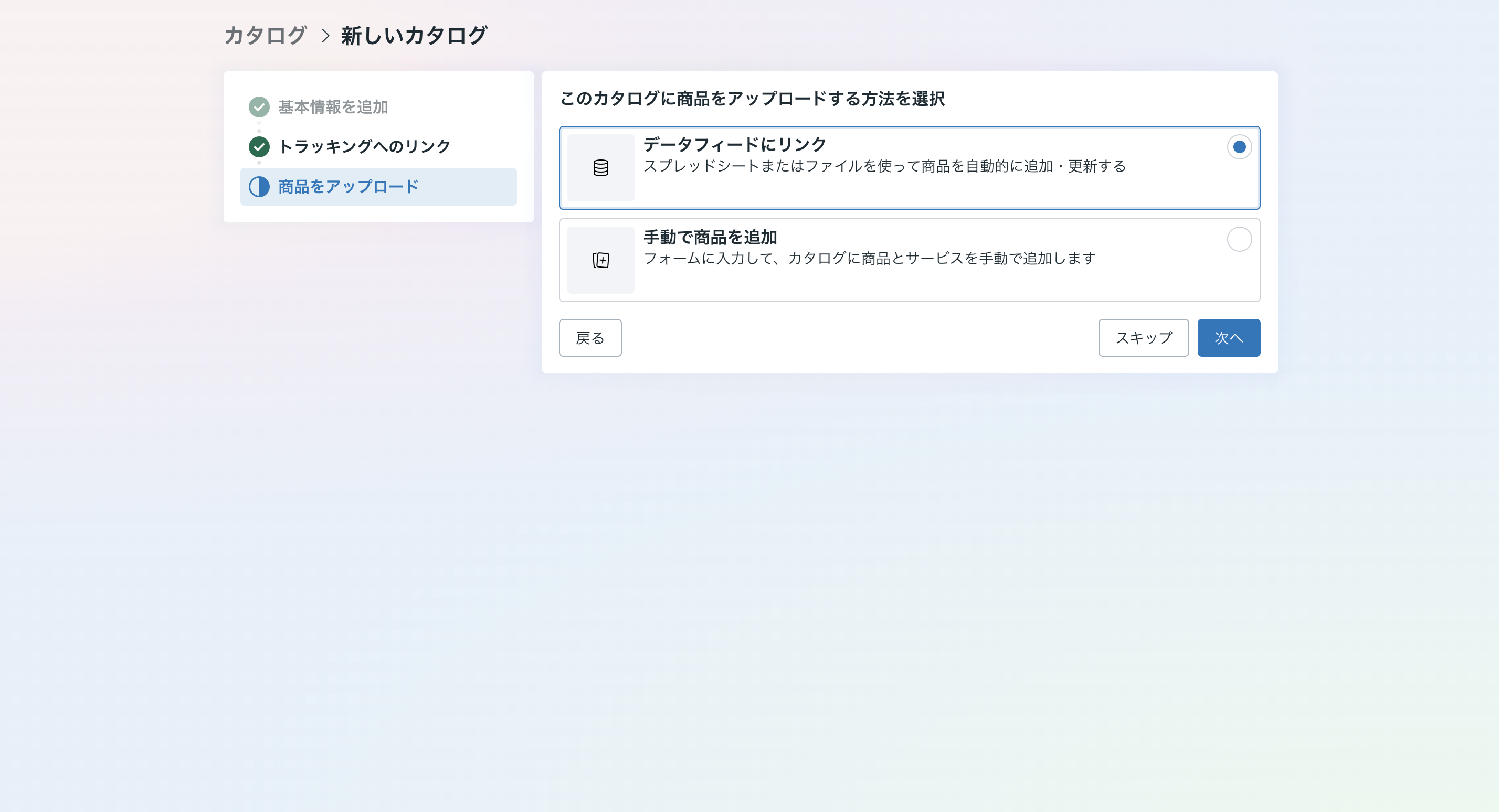 方法② 手動で商品を追加(推奨):Meta側が提供してくれるフォームに商品情報を入力して設定します。商品数がそこまで多くない場合は、1つずつフォームに入力するのが確実で、おすすめです。
