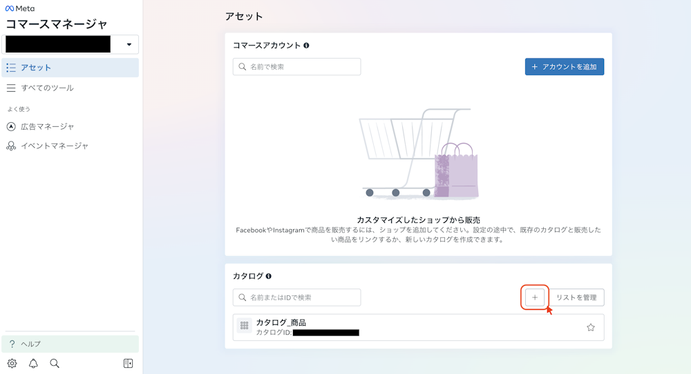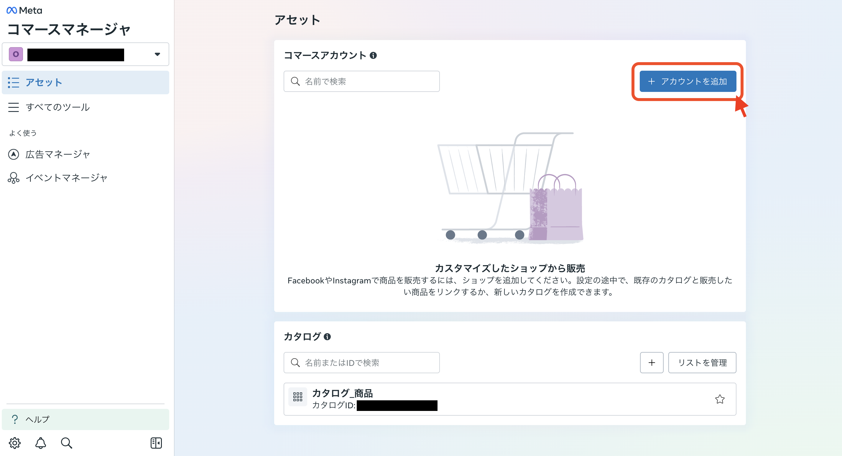 ⚠️コマースマネージャを使い始めてしばらくは、SNSアカウントの追加が行えない場合があるようです。すぐに販売を開始したい場合はここで忘れずに全てのアカウントを追加しましょう。
