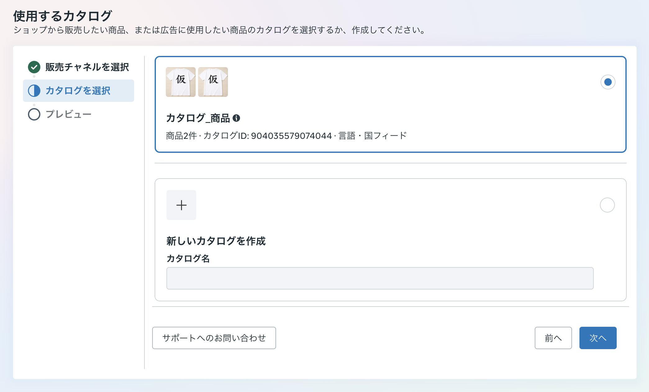 販売するカタログを選択します。先ほど作ったカタログを選択、もしくはここで新たにカタログを作ります。