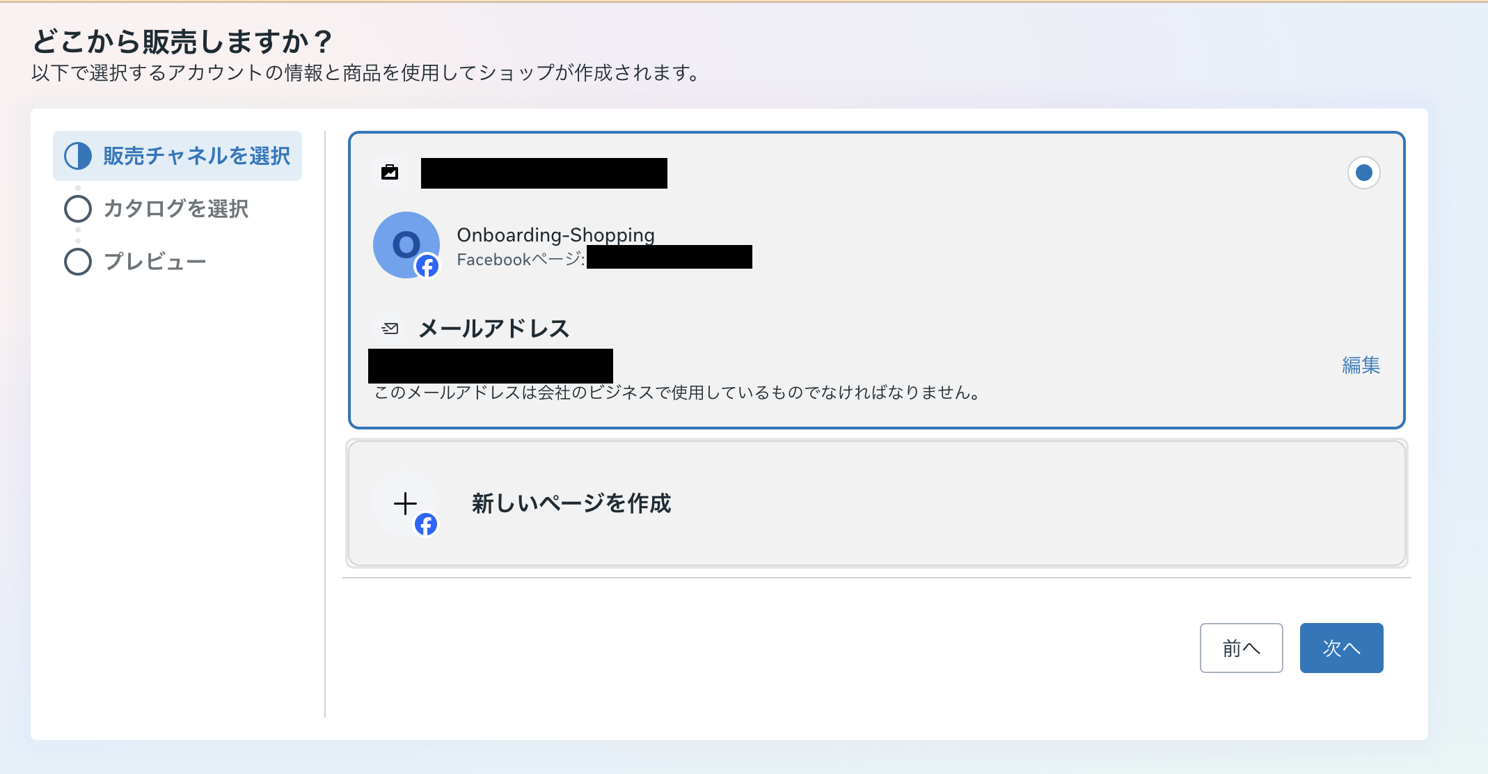 Meta Business Suite "ビジネスポートフォリオ" にて設定を行なったSNSアカウントが表示されるので、カタログに登録した商品を販売したいFacebook / Instagramアカウントを選択します。
